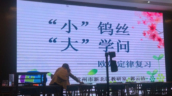 活动中,培育室领衔人郭云洁老师展示了《欧姆定律复习课》,郭老师以探究钨丝特点为主线,三次利用证明钨丝是否为导体的电路展开复习,为增大电流而引入欧姆定律实验复习,为测出钨丝电阻而引入伏安法测电阻复习,通过实验数据计算阻值复习了串联电路电流电压特点,再以酒精灯加热钨丝观察电流表数据变化引入电表变化复习,板书设计巧妙最后形成了本章的思维导图。整节课以探究与复习明暗两条线完成教学,环环相扣、层层推进,挖掘了欧姆定律知识的内涵,夯实基础,提升了学生的核心素养与能力。