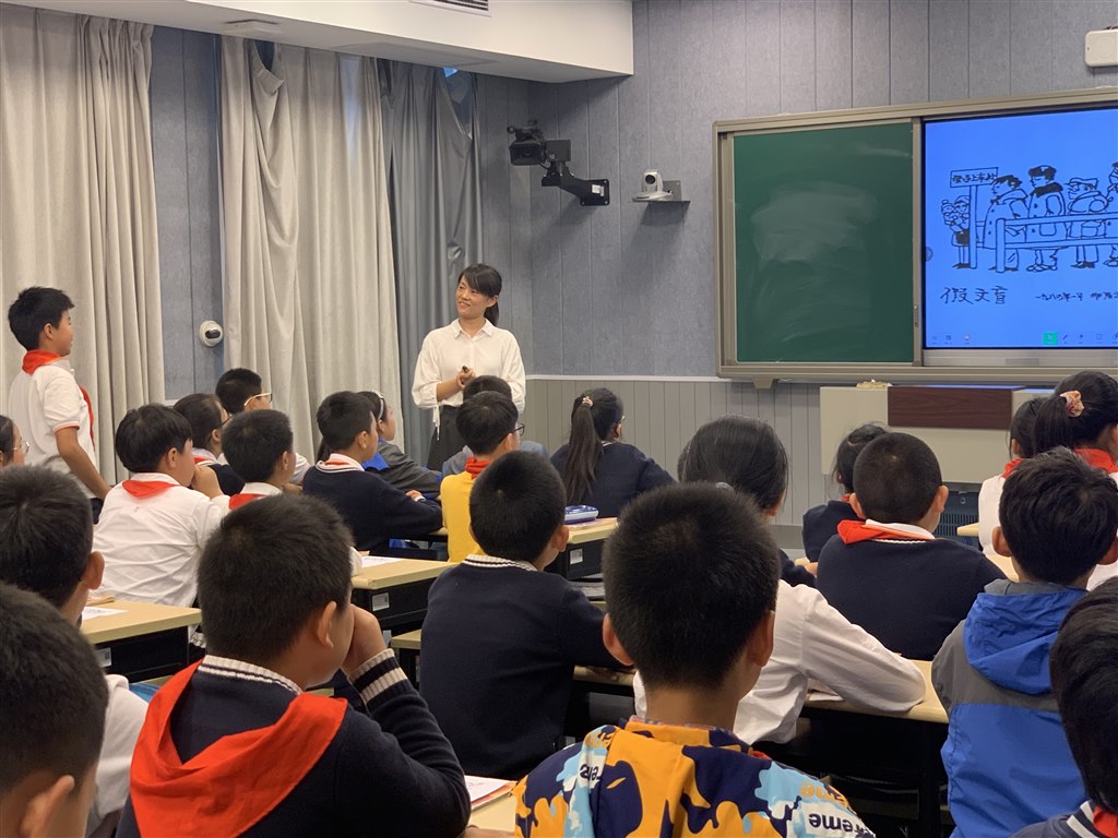 第一节课程杨老师带来的是五年级下册《习作八:漫画的启示》。课堂从“漫画”出发,一幅幅幽默风趣的漫画一下子吸引了学生的目光,在分享中学生不仅获得了快乐,也初步认识漫画。对于漫画中隐藏的启示,程老师引导学生“自悟自构”,在思维的碰撞中感受漫画的讽刺性寓意。不论是漫画,亦或是文字,都是表达的一种载体。学生在程老师的带领下,走近漫画,读懂漫画,表达之花悄然开放。