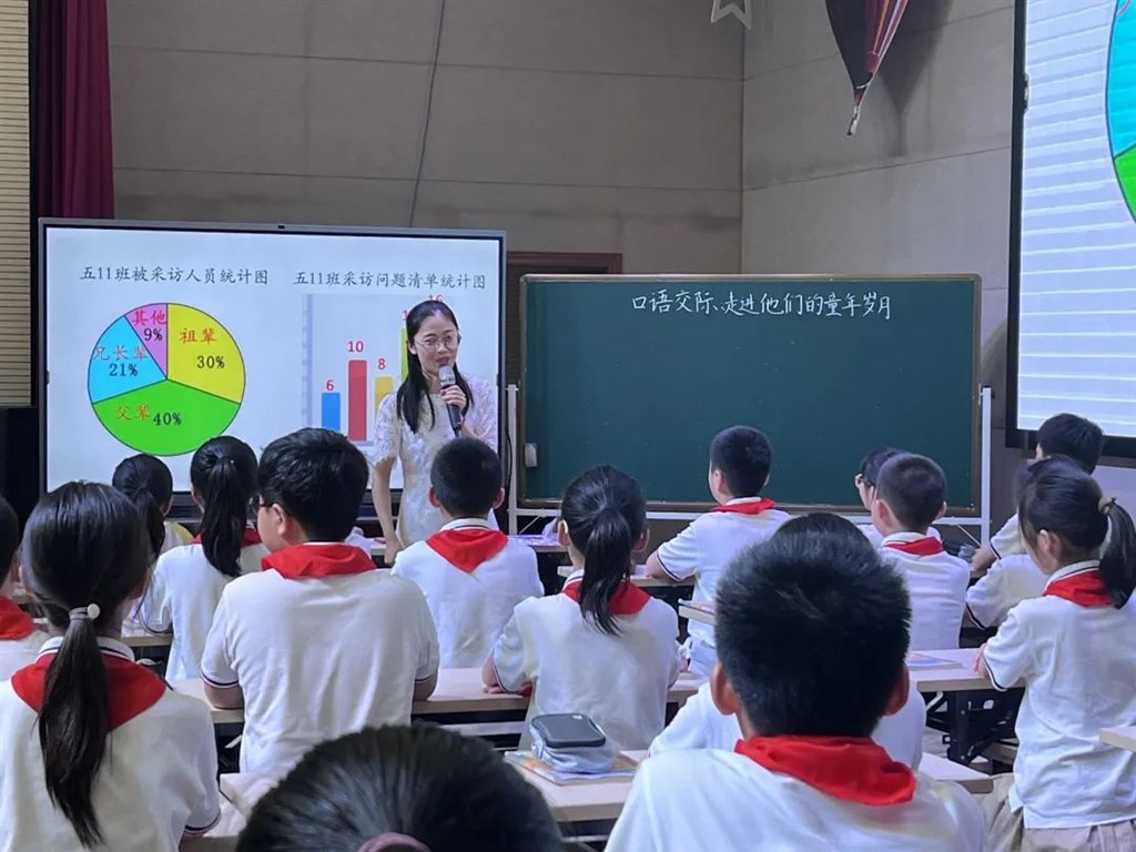 金丹老师执教五下《走进他们的童年岁月》,以红领巾广播站开设“走进他们的童年岁月”专题播报,招募播报记者为主题情境展开教学。同学们在金牌播报员的采访视频中学习提问、记录、播报的方法,在小组播报练习及评价中明确播报及倾听要求。在播报中,同学们在点评和追问中实现“交际”,共同提升言说能力。
